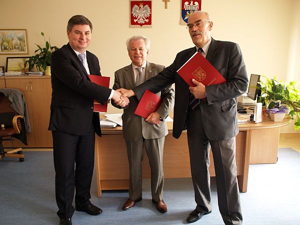 Porozumienie podpisali przedstawiciele siedmiu samorządów. Na zdjęciu od lewej: starosta legionowski Jan Grabiec, zastępca burmistrza Radzymina Andrzej Siarna i wicestarosta wołomiński Konrad Rytel. |